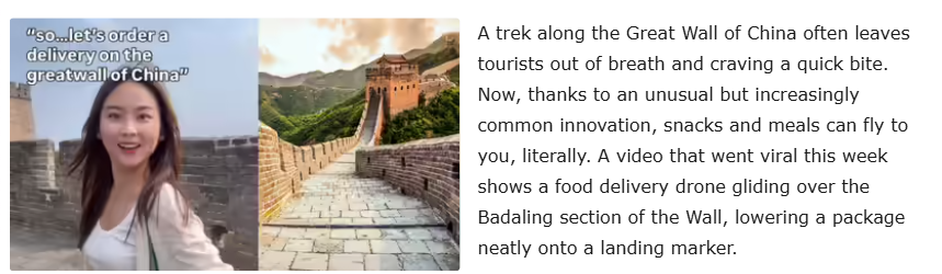 近日,一架外卖无人机在长城上为游客精准送餐的视频,引起多家外媒对中国低空经济发展的热议。