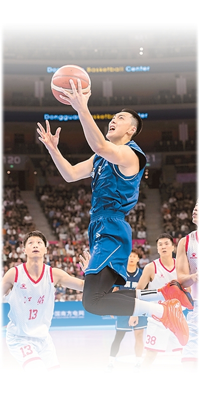 广东队球员胡明轩(上)在篮球男子成年组比赛中突破上篮。新华社记者 李博摄