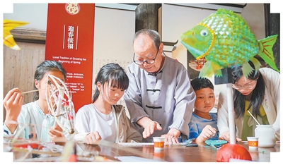非遗代表性传承人涂声福正在教小朋友制作鱼子灯。