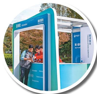 日前,进博会志愿者在国家会展中心(上海)为外国展商指路。王 初摄(人民视觉)